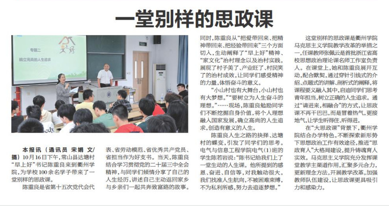 10月16日下午,常山县达塘村“早上好”书记陈重良来到必赢3003no1线路检测中心,为学校100余名学子带来了一堂别样的思政课。