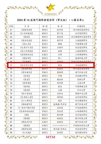 11月18日,2024第14屆澳门国际电影节(学生组)入围名单公布。其中,衢州高校学生参与制作电影《水中有片云》入围澳门国际微电影节。