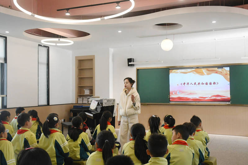 “起来!不愿做奴隶的人们!把我们的血肉筑成我们新的长城!”除了精彩的红色故事宣讲,灵溪校区大队辅导员何木兰还在教学展示中,以一堂形式新颖的音乐思政课,带领少先队员们走进那段波澜壮阔的历史中。