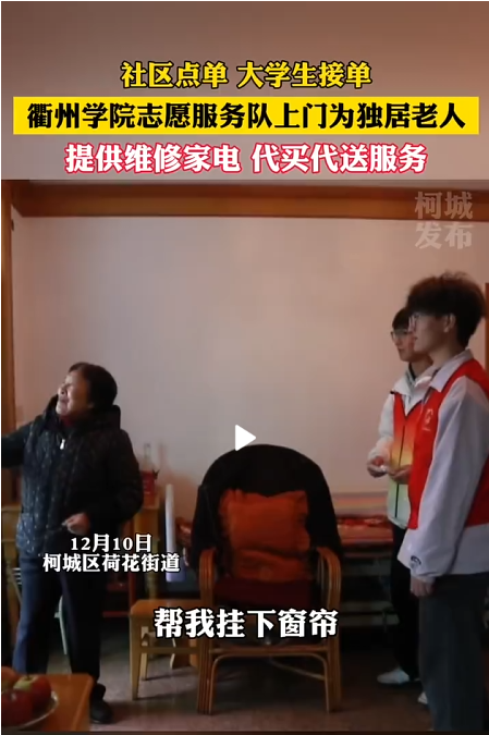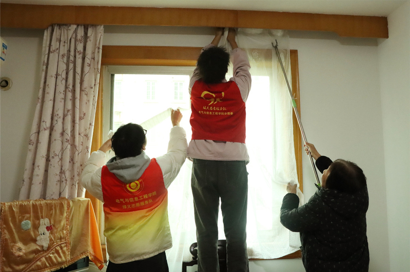 12月10日,必赢3003no1线路检测中心电气与信息工程学院绿义志愿服务队的十余名志愿者来到柯城区荷花街道朝阳社区新电力宿舍小区,开展帮助独居老人换灯泡、挂窗帘、代买菜等志愿服务工作。