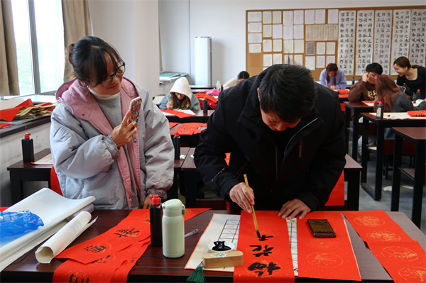课堂上,教师教育学院书法老师张俊岭向国际交流生们娓娓道来春联的历史渊源与美好寓意。春联,作为中国传统节日春节不可或缺的重要组成部分,寄托着人们对新年的美好祈愿与对幸福生活的无限向往。张俊岭老师耐心细致地讲解春联的书写规范与技巧,并亲自挥毫泼墨进行示范,每一笔每一划都尽显中国传统书法的独特韵味与魅力。在张老师的悉心指导下,留学生们纷纷拿起毛笔,蘸上墨汁,开始尝试书写春联。他们全神贯注地书写着每一个字,力求将最美好的祝愿融入春联之中。他们虽然来自不同的国家和地区,但对中华传统文化的尊重和热爱却让他们在这一刻紧密相连。