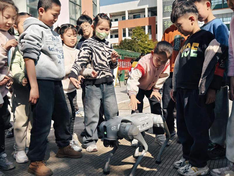 “动了动了!真厉害!”衢州市衢江区实验小学的操场上热闹非凡,科技大篷车刚现身,就被同学们围得水泄不通。五年级的柯妍同学脸颊泛红,双手微微颤抖,带着紧张与期待,轻轻按下机器狗的启动键。机器狗灵活迈步,她的眼睛瞬间瞪得又大又圆,满是好奇与惊喜,那目光中闪烁着对科学探索的强烈渴望,周围同学也都伸长脖子,惊叹连连。