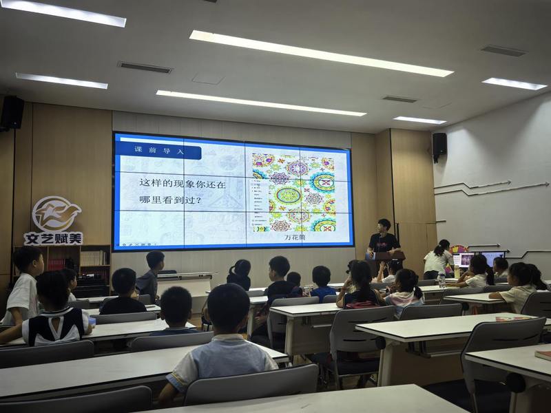 课程设置丰富多彩,涵盖书法、文艺、书画等传统艺术,更与时俱进地引入AI科普、防溺水安全教育、围棋等前沿及实用内容。7月11日,30多位小朋友就在大学生志愿者指导下,兴致盎然地制作了心爱的万花筒,二年级学生樊芷瑜开心地表示:“我真喜欢今天的课啊,做了我最喜欢的万花筒!”