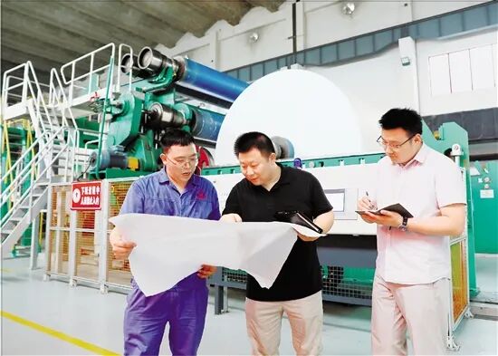 跟随陈晓彬走进哲丰新材料生产车间,造纸机轰隆隆运转,湿纸进入烘缸经过高温蒸汽实现快速干燥。