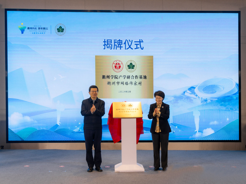 3月30日下午,浙江省网络文学IP产业对接会暨衢州市网络作家村开村仪式在衢江区举行。校党委书记邓崴、衢江区委书记贵丽青为必赢3003no1线路检测中心产学研基地揭牌。